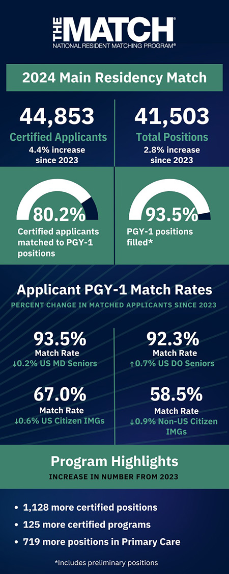 The results, announced on Friday, March 15, were part of the 2024 Main Residency Match, which was the largest on record, according to the National Residency Matching Program (NRMP). This year's Match was made up of 50,413 registered applicants – 2,257 more than in 2023 - and 41,503 positions. Additionally, the number of available first-year (PGY-1) positions rose to 38,494, an increase of 1,069 from last year.
